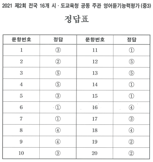 | 2021년 제1회 중3 영어듣기평가 기출문제,문제지,정답,듣기파일 (0) | 2022.01.03 |