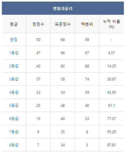 <2020년 11월 고2 모의고사 생활과윤리 등급컷>