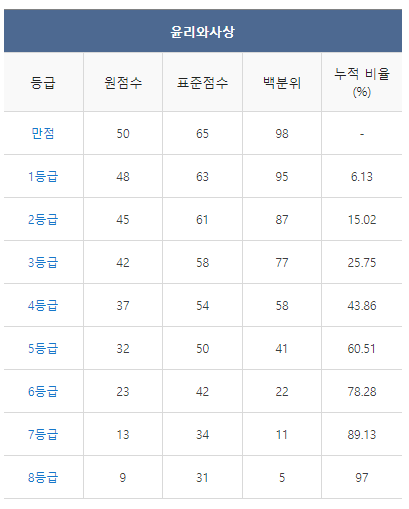 <2021년 3월 고2 모의고사 윤리와사상 등급컷>