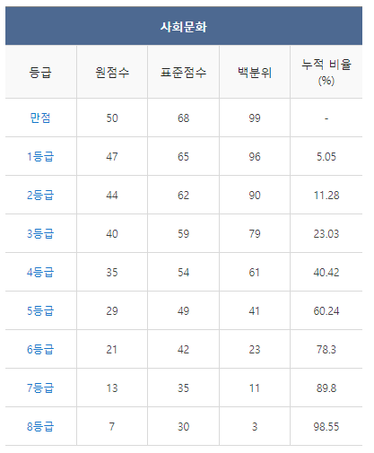 <2021년 3월 고2 모의고사 사회문화 등급컷>