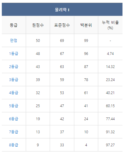 <2021년 3월 고2 모의고사 물리1 등급컷>