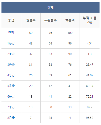 <2021년 3월 고2 모의고사 경제 등급컷>