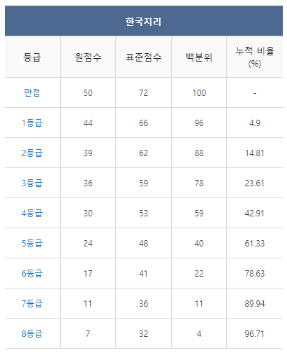<2021년 3월 고2 모의고사 한국지리 등급컷>