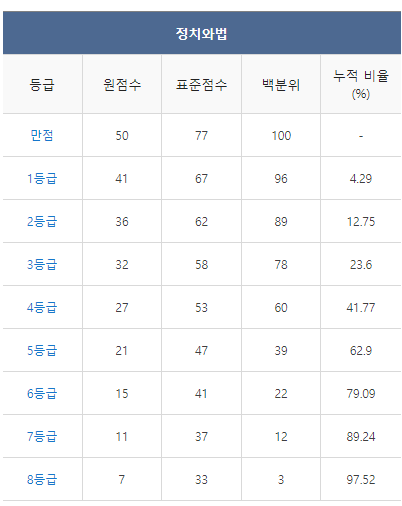 <2021년 3월 고2 모의고사 정치와법 등급컷>