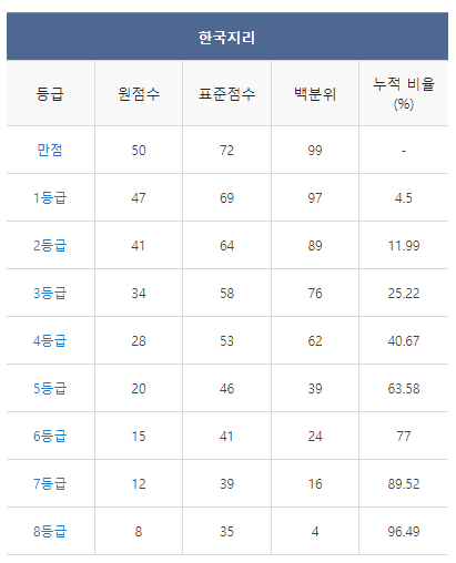 <2021년 4월 고3 모의고사/학력평가 한국지리 등급컷>