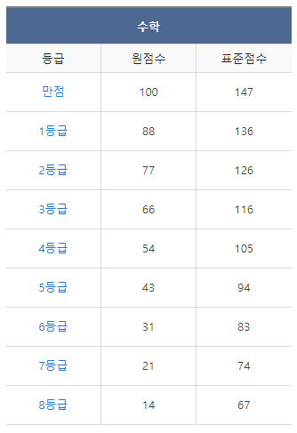 <2022년 3월 고1 모의고사/학력평가 수학 등급컷>