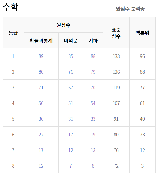 <2022년 대학수학능력시험,수능 수학 등급컷>