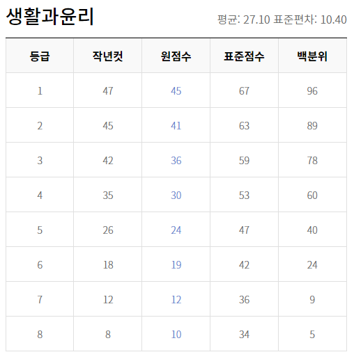 <2022년 대학수학능력시험,수능 생활과윤리 등급컷>