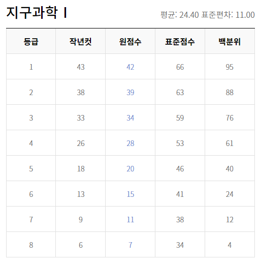 <2022년 대학수학능력시험,수능 지구과학1 등급컷>