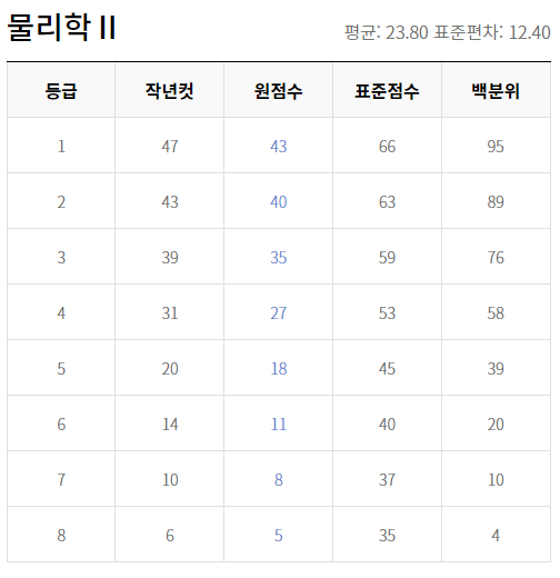 <2022년 대학수학능력시험,수능 물리학2 등급컷>