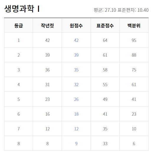 <2022년 대학수학능력시험,수능 생명과학1 등급컷>