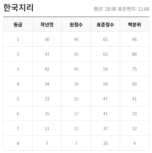 <2022년 대학수학능력시험,수능 한국지리 등급컷>