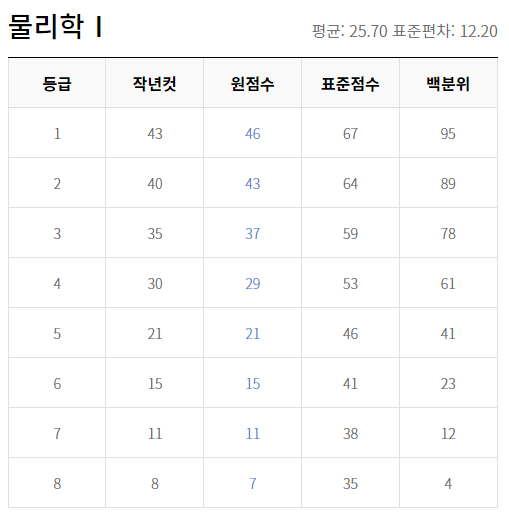 <2022년 대학수학능력시험,수능 물리학1 등급컷>