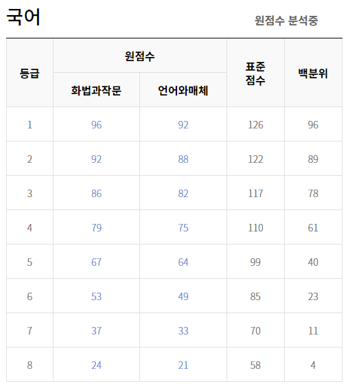 <2022년 대학수학능력시험,수능 국어 등급컷>
