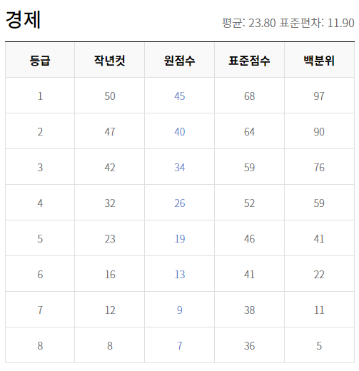 <2022년 대학수학능력시험,수능 경제 등급컷>