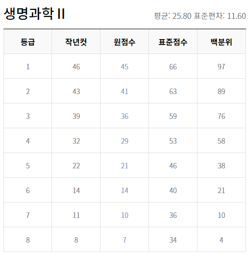 <2022년 대학수학능력시험,수능 생명과학2 등급컷>