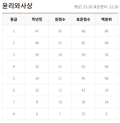<2022년 대학수학능력시험,수능 윤리와사상 등급컷>