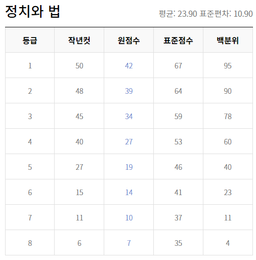 <2022년 대학수학능력시험,수능 정치와법 등급컷>